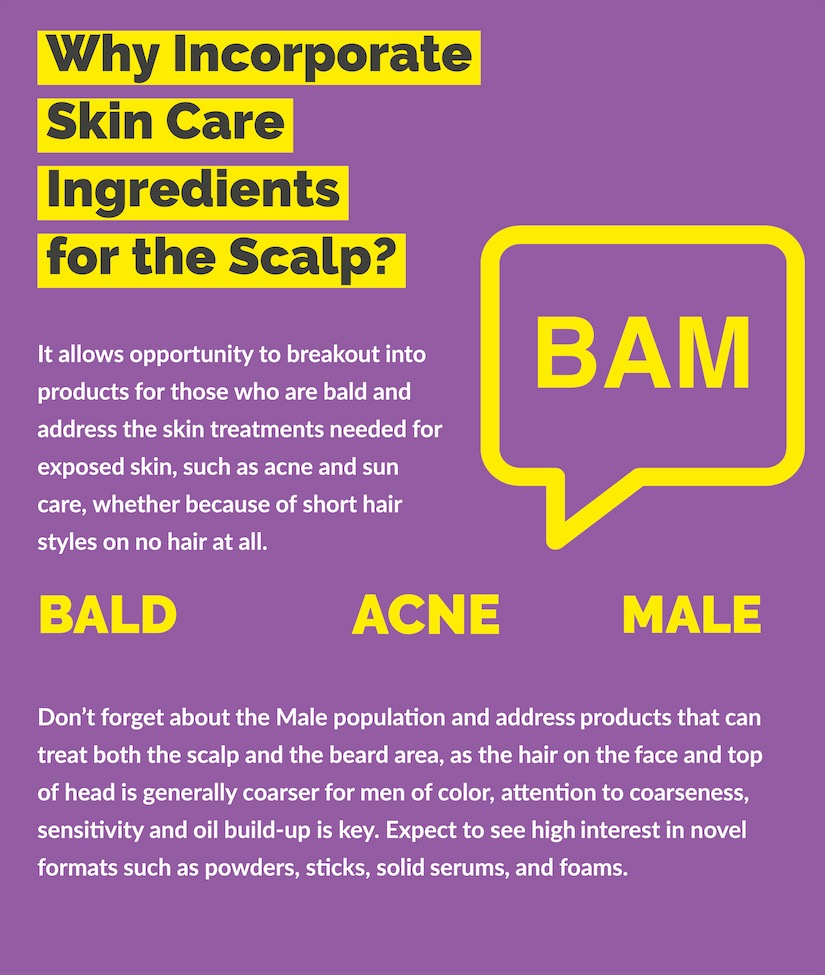 Don’t forget about the Male population and address products that can treat both the scalp and the beard area, as the hair on the face and top of head is generally coarser for men of color, attention to coarseness, sensitivity and oil build-up is key. Expect to see high interest in novel formats such as powders, sticks, solid serums, and foams.